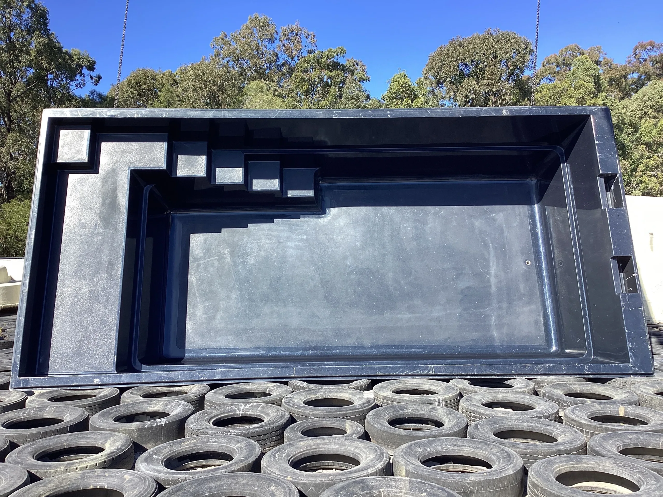 This example is finished in blue black shimmer with silver and blue flecks set into the black base colour. Structurally perfect this pool has a few scuffs and marks on the side walls and a dullness to the textured floor panel that makes it a Factory Second. Deep scratches on the top coping are unsightly but would be covered by paving when the pool is installed.